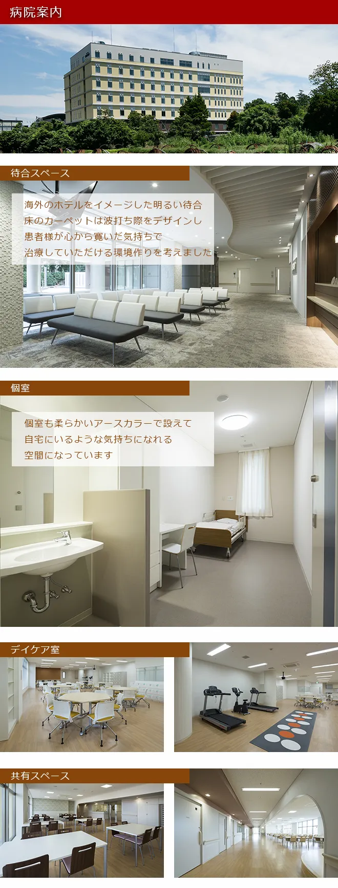 新棟の外壁は明るくモダンな色調にし、海外のホテルをイメージしました。外来を入りますと、お客様を快くお迎えする壁面アート、さらに待合の床のカーペットは波打ち際をデザインし、寛げるよう工夫しました。病室の色調も明るく楽しい雰囲気にし、デイルームは寛ぎを感じさせる空間となっております。様々なイベントで楽しく過ごしていただける企画も用意します。ホテルで過ごすような気持ちで治療していただける環境づくりを考えました。
